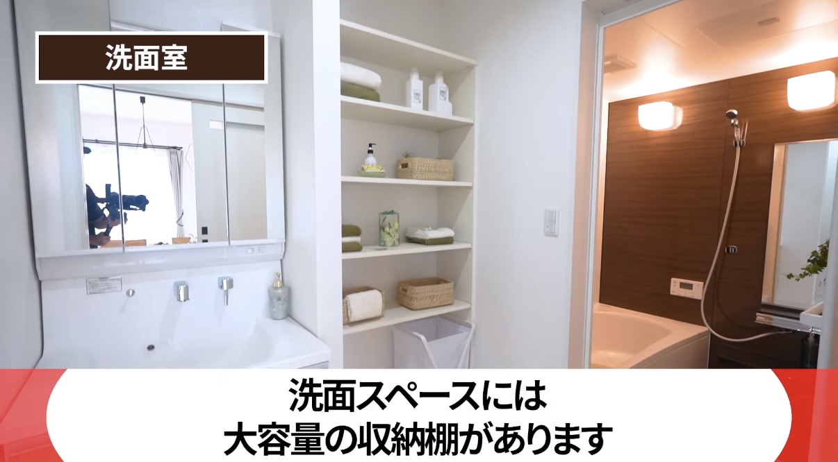 洗面室は家族全員が使うことを想定し、大容量の収納が備わっている点が特徴です。