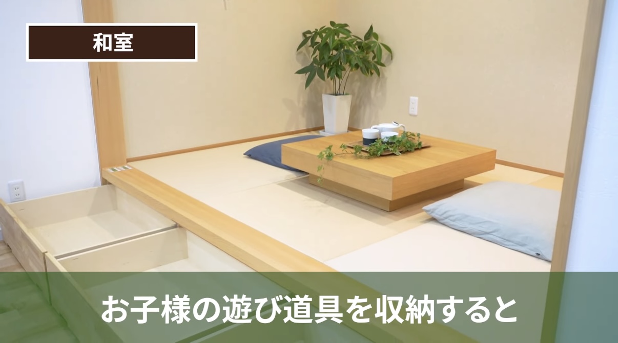 リビングに隣接する和室は、子どもの遊び場に最適です。動画で紹介されている和室はリビングから一段高くなっており、その下のスペースが収納になっている点が特徴です。
