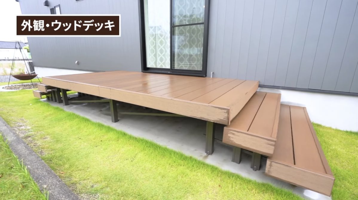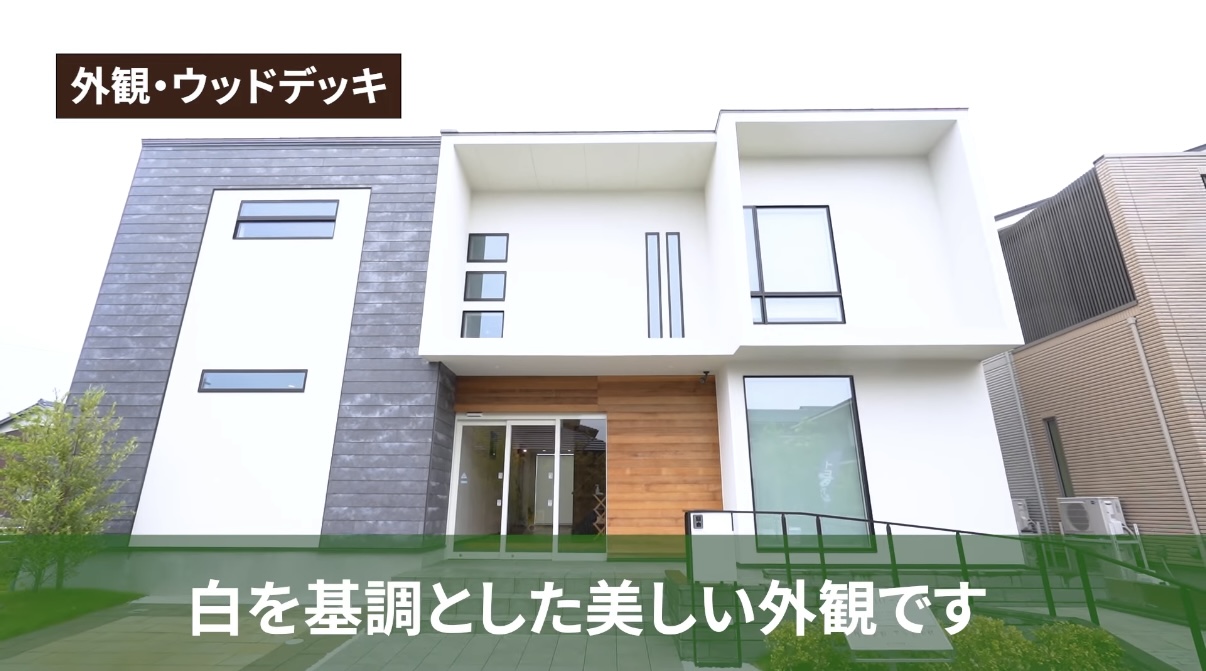外観は、白を基調としたシンプルで上品なデザインが特徴です。ウッドデッキを設置することで、庭とリビングをつなぐ開放的な空間が生まれ、室内と外の自然を感じながら過ごせます。