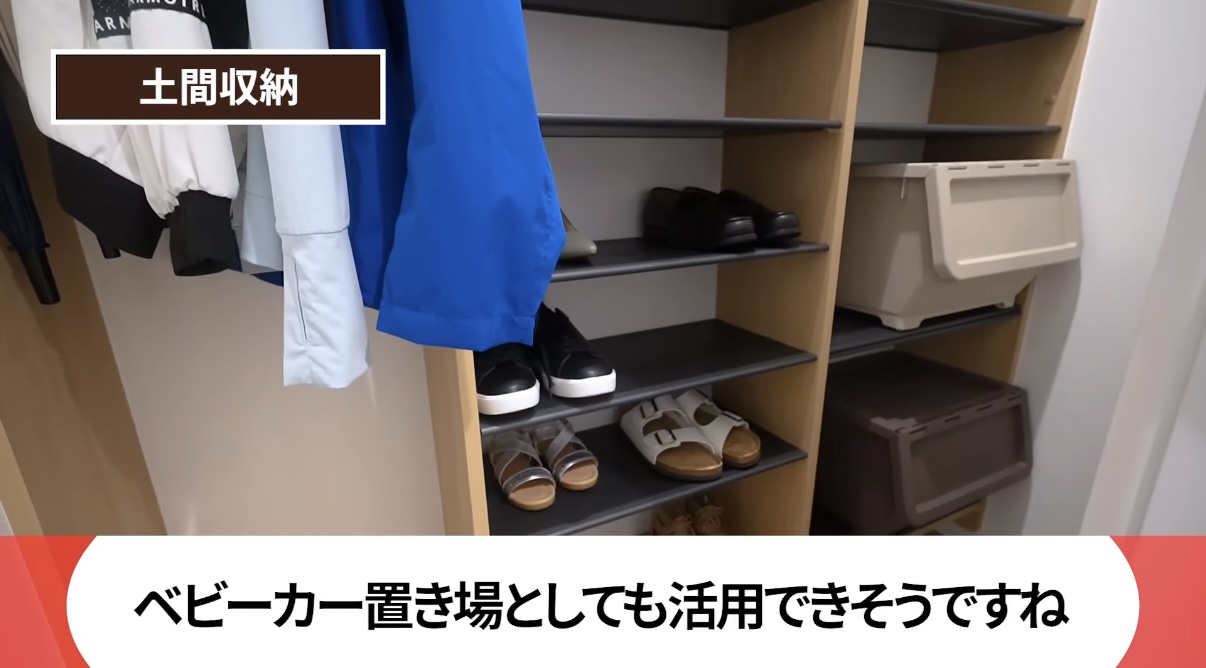 玄関を入ってすぐ左側には、広々とした土間収納があります。ベビーカーや外遊び用具、ゴルフバッグなどかさばる荷物もすっきり収まる広さを確保。収納棚やフックを活用すれば小物も整理しやすく、家族がスムーズに出入りできる動線を確保できます。