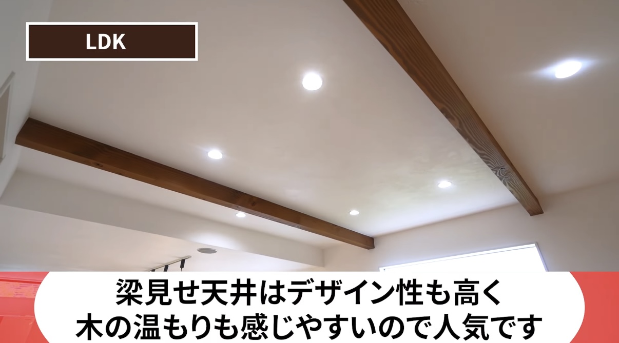 梁見せ天井は、構造材である梁をあえて隠さずに見せることで、空間に温かみとダイナミックさを生み出すデザインです。天井が高く感じられ、開放的なリビングを演出します。